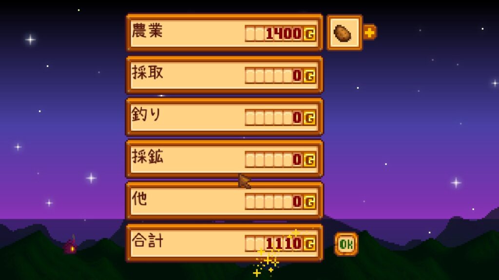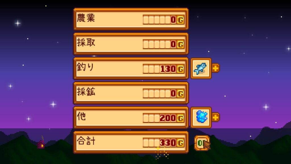 出荷箱に何か入れた場合はこのようにリザルトが出るよ! 330Gもらえた!